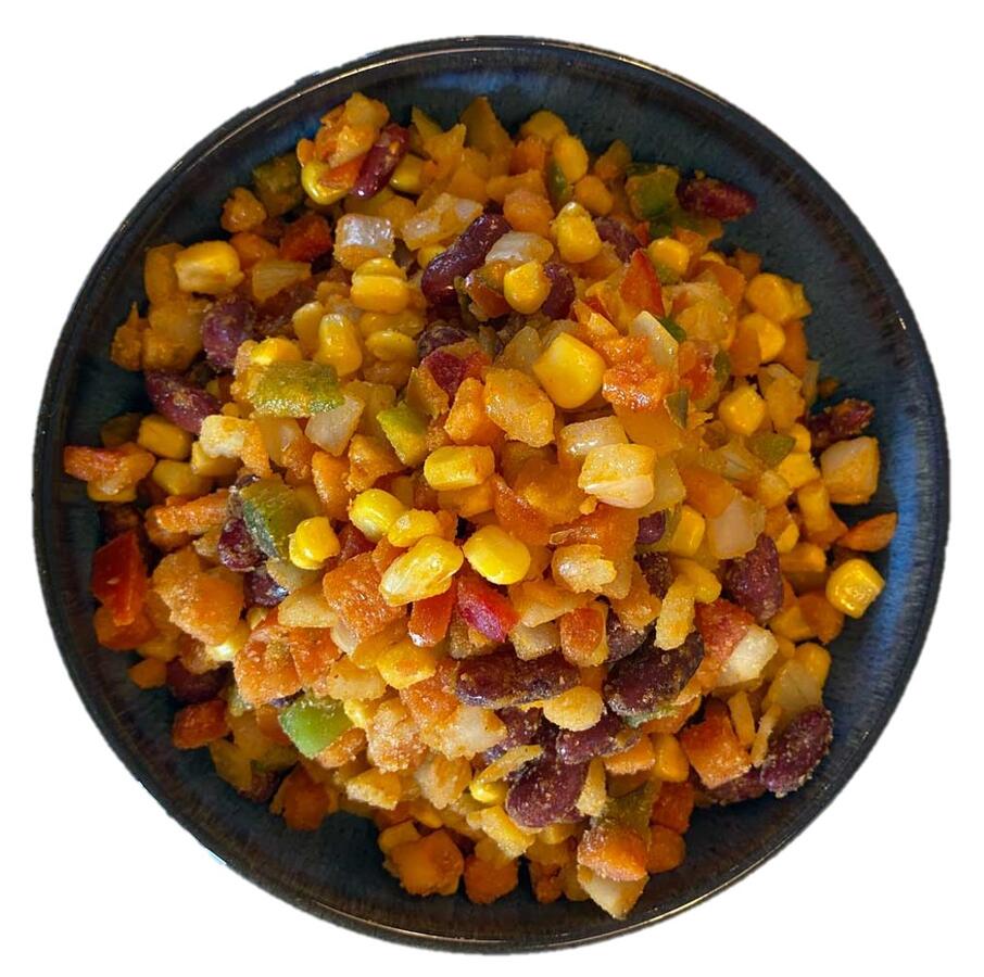 - Ingredienser Tomat 24 %, løg 18 %, blancerhede majs 18 %, blandede peberfrugter 18 %, kidneybønner 16 %, vand, rapsolie, solsikkeolie, salt, tomatkoncentrat, sukker, eddike, svampeekstrakt, løgpulver, tomatpulver, ristet løgpulver, paprika, chili, kommen, gurkemeje, naturlig aroma, hvid peber, SELLERI, stivelse.