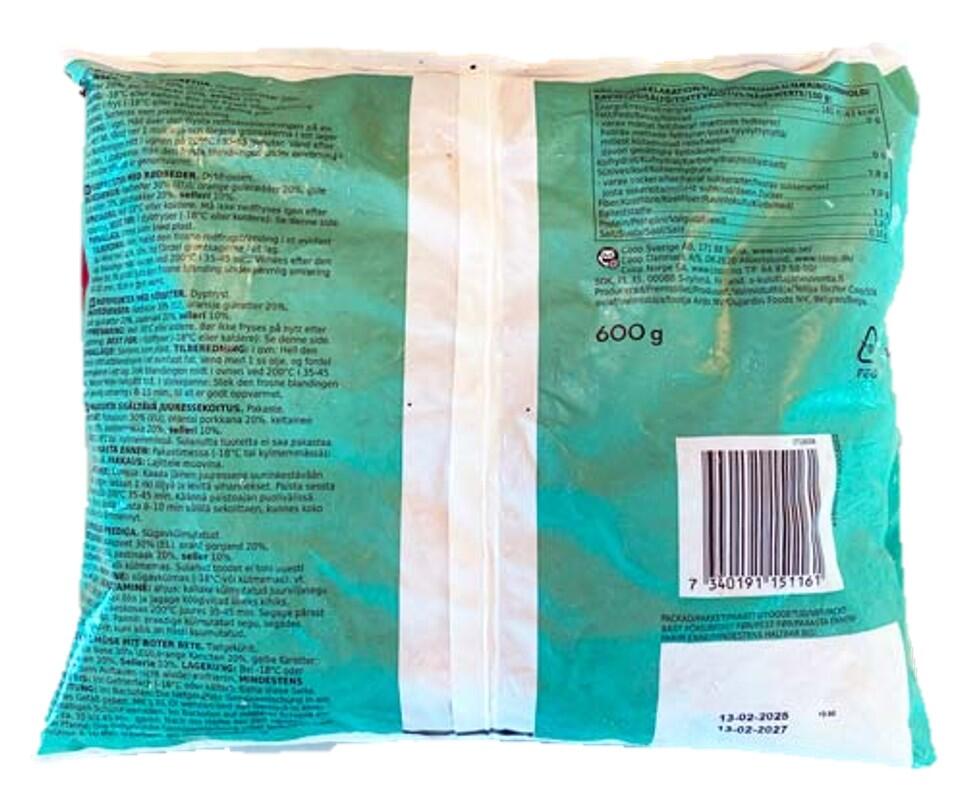 - Ingredienser Rødbede 30 %, orange gulerødder 20 %, gule gulerødder 20 %, pastinakker 20 %, SELLERI 10 %