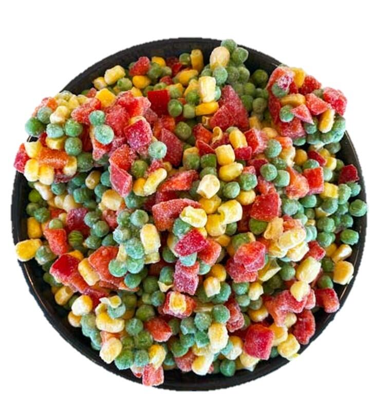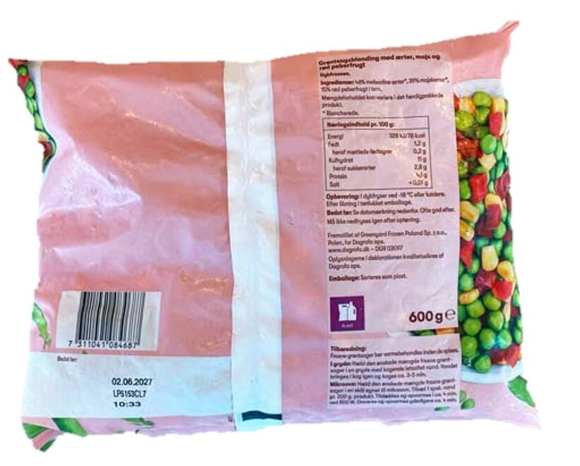 - Ingredienser 46 % mellemfine ærter, 39 % majskerner, 15 % rød peberfrugt i tern