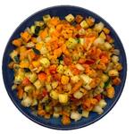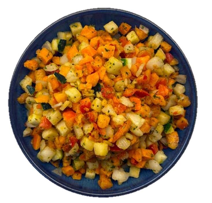 - Ingredienser 90,85 % grøntsager, mængdeforholdet kan variere i det færdigpakkede produkt (heraf tomat, gulerødder, rød, grøn og gul peberfrugt, løg, SELLERI, squash), 9,15 % sauce [vand, blandingsolier med smag (rapsolie, solsikkeolie, naturlig aroma), naturlig aroma, salt, basilikum, tomatpulver, sukker, grøntsagsbouillon (salt, maltodextrin, naturlig aroma, sukker, løg, tomat, gulerodsekstrakt, solsikkeolie, natulig løgaroma), hvidløg, timian, rosmarin, stegt løgpulver, rismel, hvid peber]