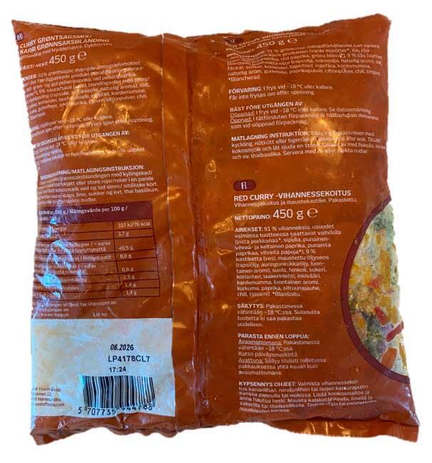 - Ingredienser 91 % grøntsager, mængdeforholdet kan variere i det færdigpakkede produkt (heraf gulerødder, løg, rød, grøn og gul peber, rød peber, grønne bønner), 9 % sauce [vand, blandingsolie med smag (rapsolie, solsikkeolie, natulig aroma), salt, fennikel, sukker, koriander, laurbærblade, ingefær, kardemomme, natulig aroma, gurkemeje, sød paprika, citronpulver, chili, timian]