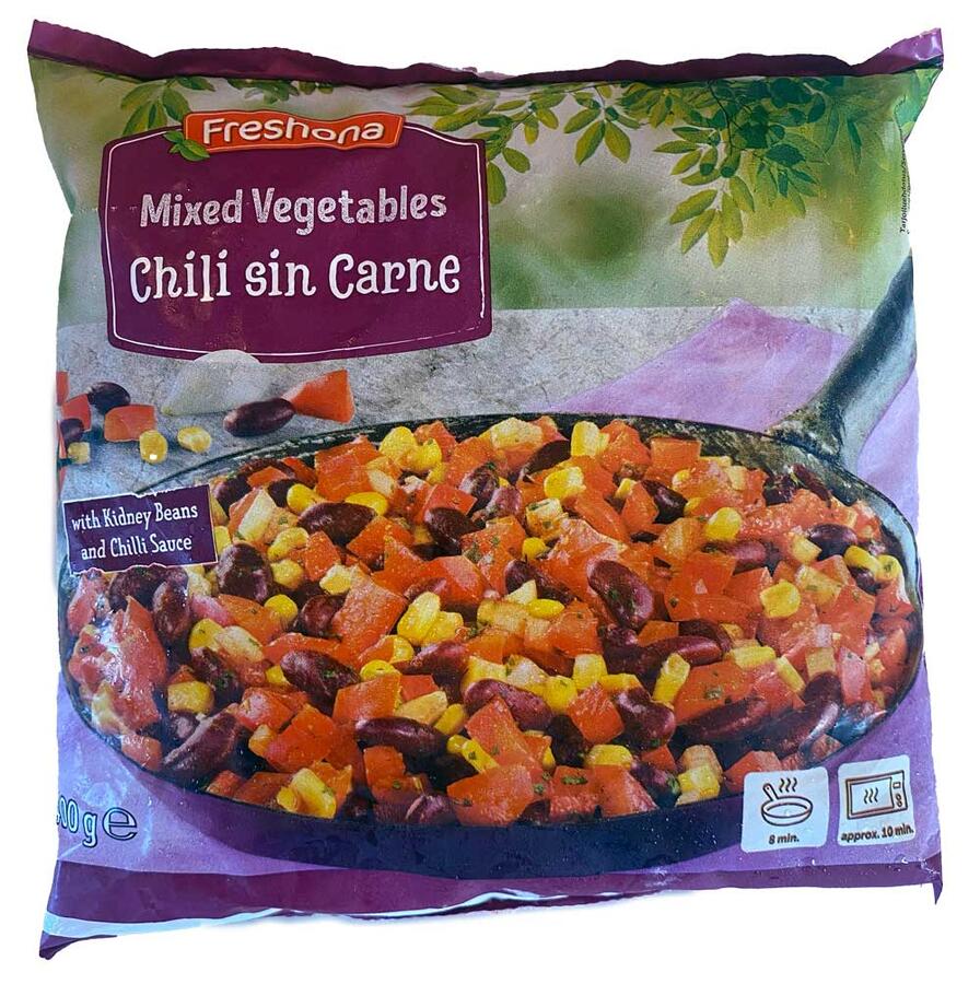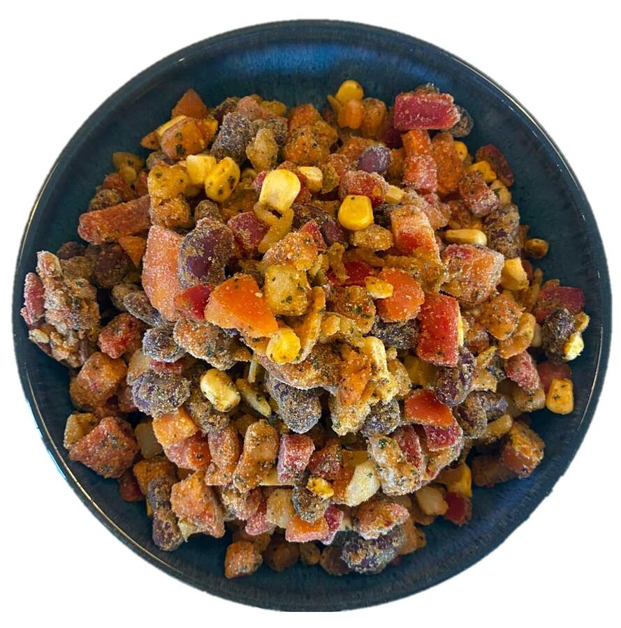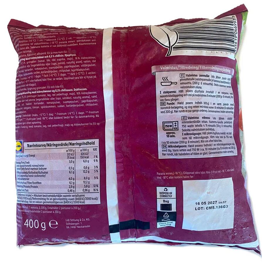 - Ingredienser 75,5 % grøntsager (tomater, løg, rød peberfrugt, majs), 16 % kidneybønner, vegetabilske olier med aroma [vegetabilske olier (raps, solsikke), naturlig aroma], vand, rød chili, salt, hakket koriander, tomatpulver, svampepulver, paprikapulver, hvidløgspulver, oregano, timian, spidskommen, sukker, korianderpulver, chilipulver, laurbærbladepulver.