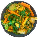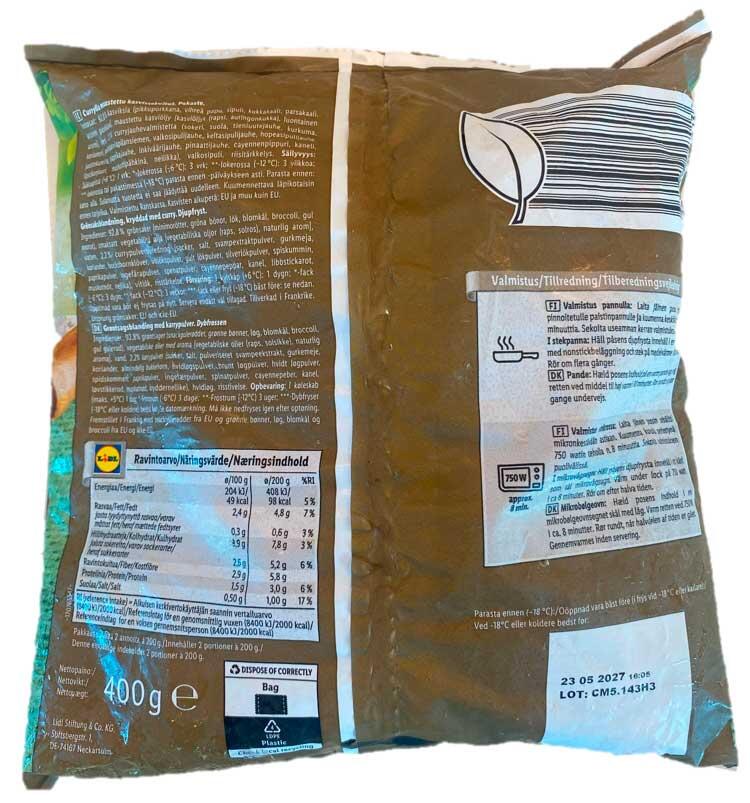 - Ingredienser 92,8 % grøntsager (snackgulerødder, grønne bønner, løg, blomkål, broccoli, gul gulerod), vegetabilske olier med aroma (vegetabilske olier (raps, solsikker), naturlig aroma), vand, 2,2 % karrypulver (sukker, salt, pulveriseret svampeekstrakt, gurkemeje, koriander, almindelig bukkehorn, hvidløgspulver, brunt løgpulver, hvidt løgpulver, spidskommen, paprikapulver, ingefærpulver, spinatpulver, cayennepeber, kanel, løvstikkerod, muskatnød, kryddernellike), hvidløg, risstivelse.