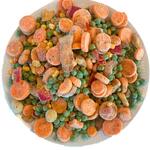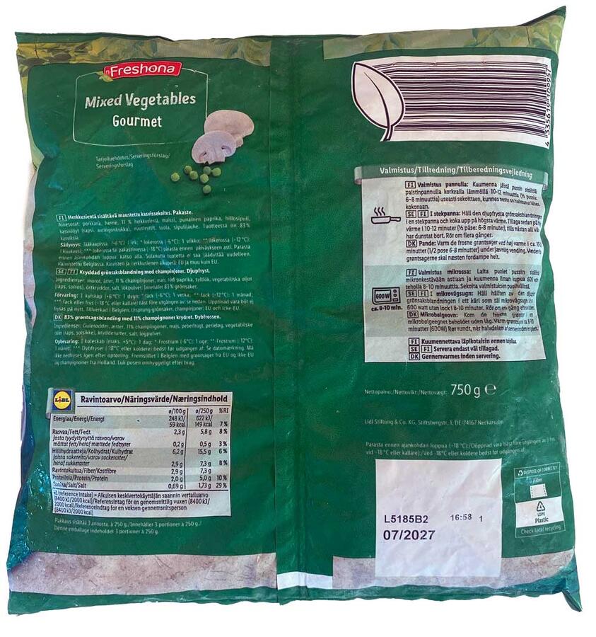 - Ingredienser Gulerødder, ærter, 11 % champignoner, majs, peberfrugt, perleløg, vegetabilske olier (raps, solsikke), krydderurter, salt, purløg