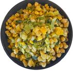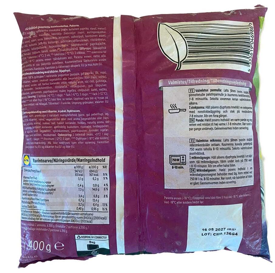 - Ingredienser 68 % grøntsager i variabelt mængdeforhold (porre, gul peberfrugt, løg, majs), 23,9 % kikærter, vand vegetabilske olier med aroma [vegetabilske olier (raps, solsikke), naturlig aroma], sukker, salt, hakket koriander, hvidløg, naturlig aroma, rød chili, gurkemeje, formalet koriander, almindelig bukkehorn, risstivelse, hvidløgspulver, brunt løgpulver, hvidt løgpulver, spidskommen, paprikapulver, formalet ingefær, chilipulver, kanel, nelliker, muskatnød.