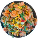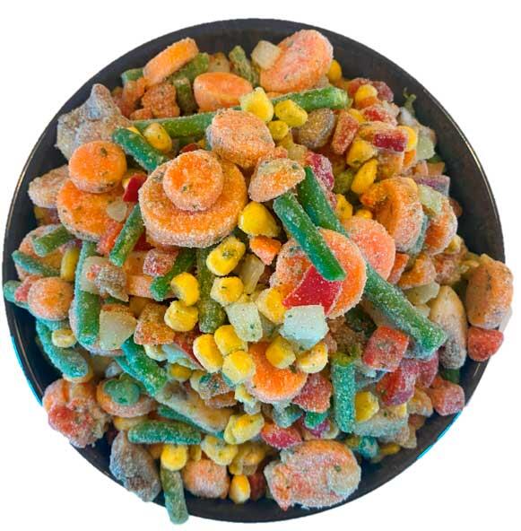 - Ingredienser 24,5% øko gulerødder, 17,5% øko majs, 17% øko grønne bønner, 15% øko rød peberfrugt, 13% øko champignoner, 8% øko løg, vand, øko solsikkeolie, salt, øko krydderurter, øko stivelse, øko ekstra jomfruolivenolie, øko krydderier,