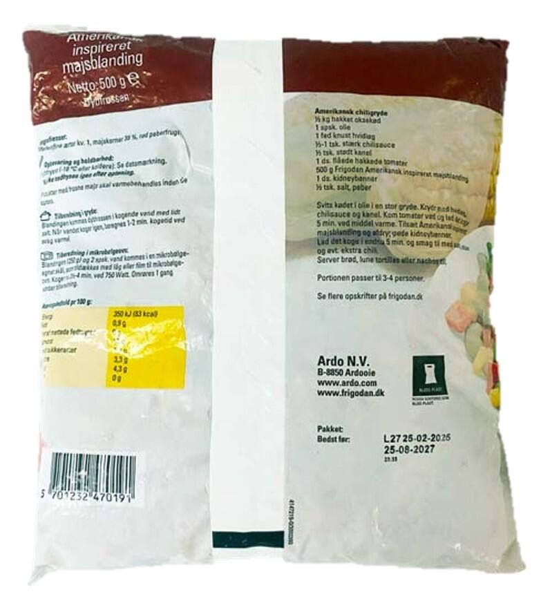 - Ingredienser Mellemfine ærter kv.1, majskerner 39 %, rød peberfrugt