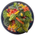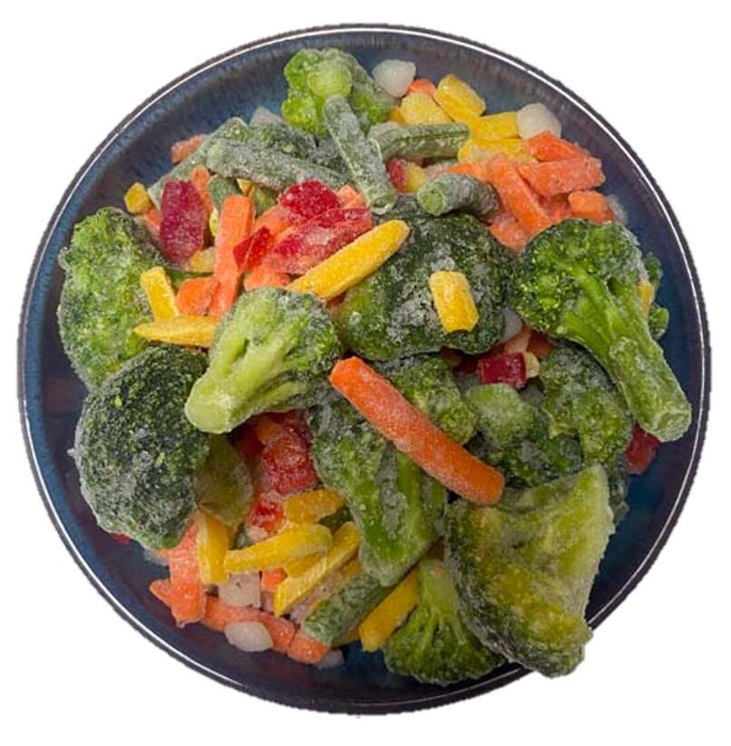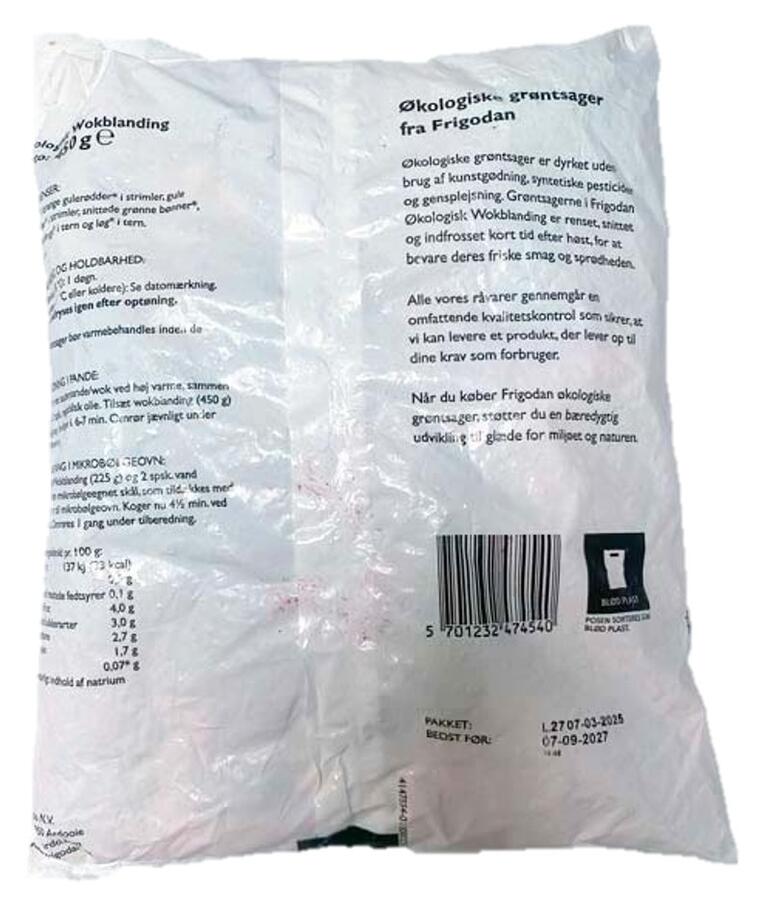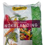 - Ingredienser Øko broccoli, øko orange gulerødder i strimler, øko gule gulerødder i strimler, øko snittede grønne bønner, øko rød peberfrugt i tern, øko løg i tern.