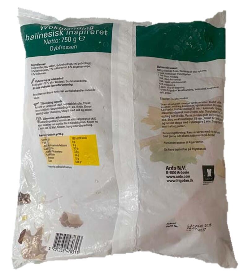 - Ingredienser Gulerødder, løg, SELLERI, gul peberfrugt, rød peberfrugt, 9 % bønnespirer, 7 % sukkerærter, 6 % skyøresvampe, 6 % babymajs.