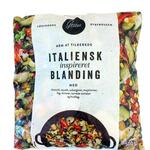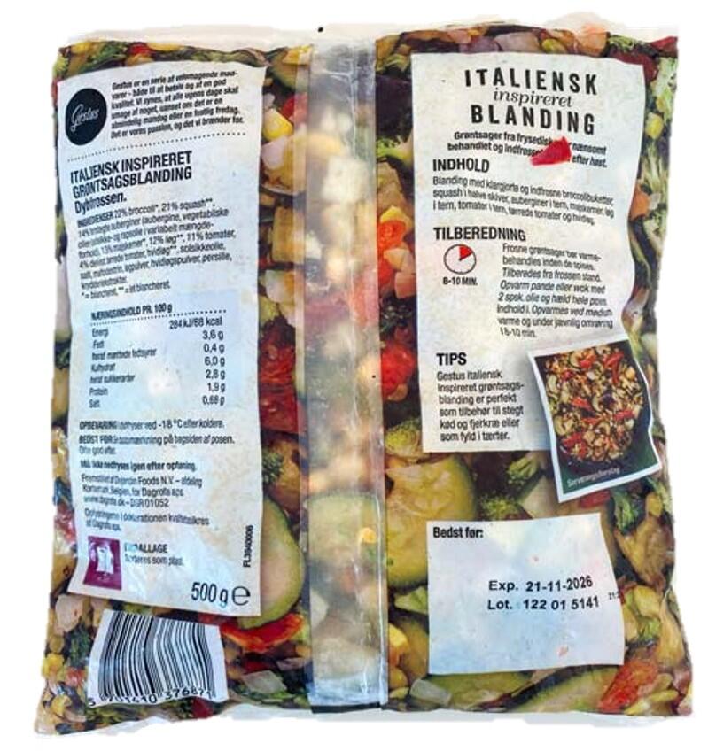 - Ingredienser 22 % broccoli, 21 % squash, 14 % forstegte auberginer (aubergine, vegetabilske olier (solsikke- og rapsolie i variabelt mængdeforhold)), 13 % majskerner, 12 % løg, 11 % tomater, 4 % delvist tørrede tomater, hvidløg, solsikkeolie, salt, maltodextrin, løgpluver, hvidløgspulver, persille, krydderiekstrakter.