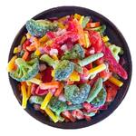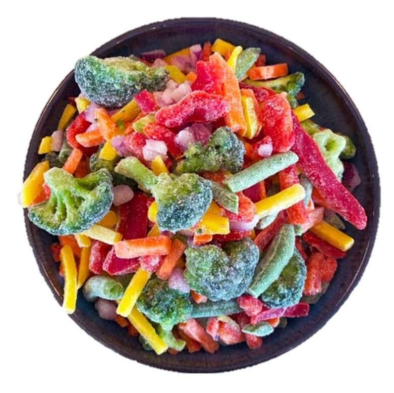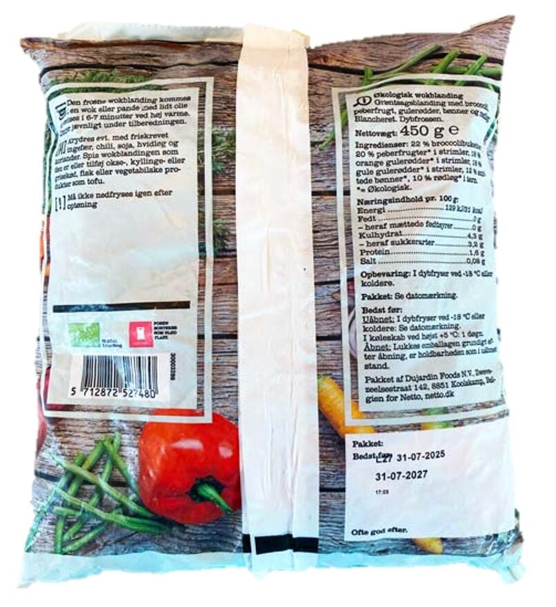- Ingredienser 22 % øko broccolibuketter, 20 % øko peberfrugter i strimler, 18 % øko orange gulerødder i strimler, 18 % øko gule gulerødder i strimler, 12 % øko snittede bønner, 10 % øko rødløg i tern.