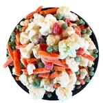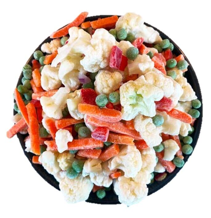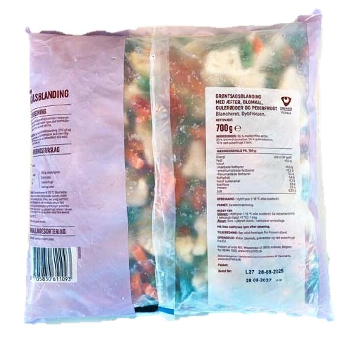 - Ingredienser 36 % mellemfine ærter, 30 % blomkålsbuketter, 24 % gulerodsstave, 10 % rød peberfrugt i tern