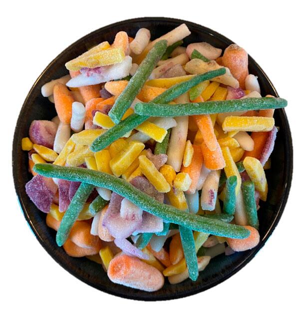 - Ingredienser 25 % babykarotter, 22 % gule gulerødder i strimler 20 % skorzonerrødder, 20 % rødløg i store tern, 13 % meget fine bønner