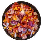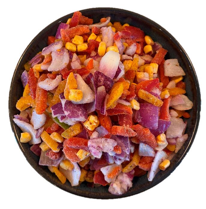 - Ingredienser 32 % rødløg i store tern, 24 % rød peberfrugt i strimler, 20 % majskerner 20 % gul peberfrugt i strimler, hvidløg i tern, krydderier (paprika, hvidløg, peber, gurkemejerod, ingerfær, koriander, kommen, chili, spidskommen, bukkehornsfrø, basilikum, oregano, merian, timian, rosmarin), gærekstrakt, tørret løg, salt, dextrose, surhedsregulerende middel (E 330), peberekstrakt.