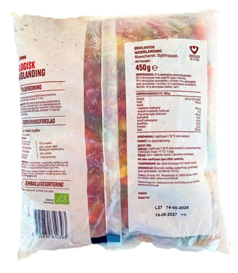 - Ingredienser 22 % øko broccolibuketter, 20 % øko røde peberfrugter i strimler, 18 % øko gulerødder i strimler, 18 % øko gule gulerødder i strimler, 12 % øko overskårne bønner, 10 % øko løg i tern.