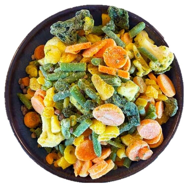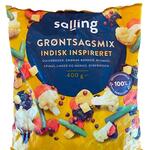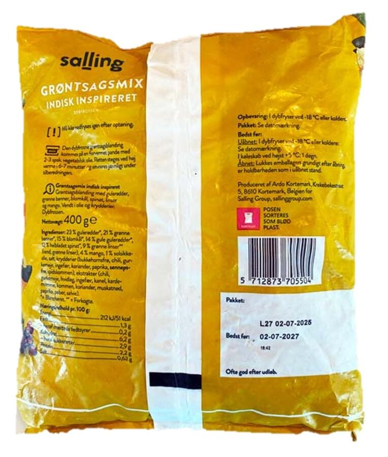 - Ingredienser 23 % gulerødder, 21 % grønne bønner, 15 % blomkål, 14 % gule gulerødder, 12 % helbladet spinat, 9 % grønne linser (vand, grønne linser), 4 % mango, 1 % solsikkeolie, salt, krydderier (bukkehornsfrø, chili, gurkemeje, ingefær, koriander, paprika, SENNEPSFRØ, spidskommen), ekstrakter (chili, gurkemeje, hvidløg, ingefær, kanel, kardemomme, kommen, koriander, muskatnød, paprika, peber, salvie).