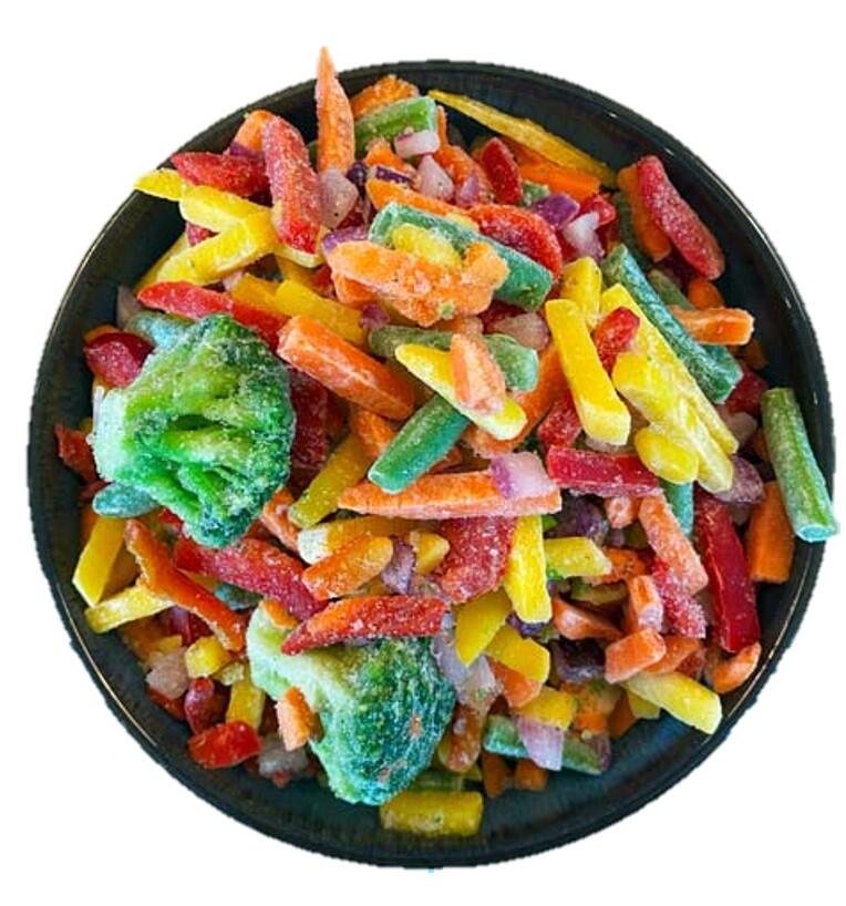 - Ingredienser 22 % øko broccolibuketter, 20 % øko peberfrugter i strimler, 18 % øko gulerødder i strimler, 18 % øko gule gulerødder i strimler, 12 % øko snittede bønner, 10 % øko rødløg i tern.