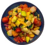 - Ingredienser 30 % cherrytomater, 28 % courgetter, 15 % løg, 14 % rød peberfrugt, 12 % gul peberfrugt, salt, krydderiblanding (hvidløg, peber, timian).